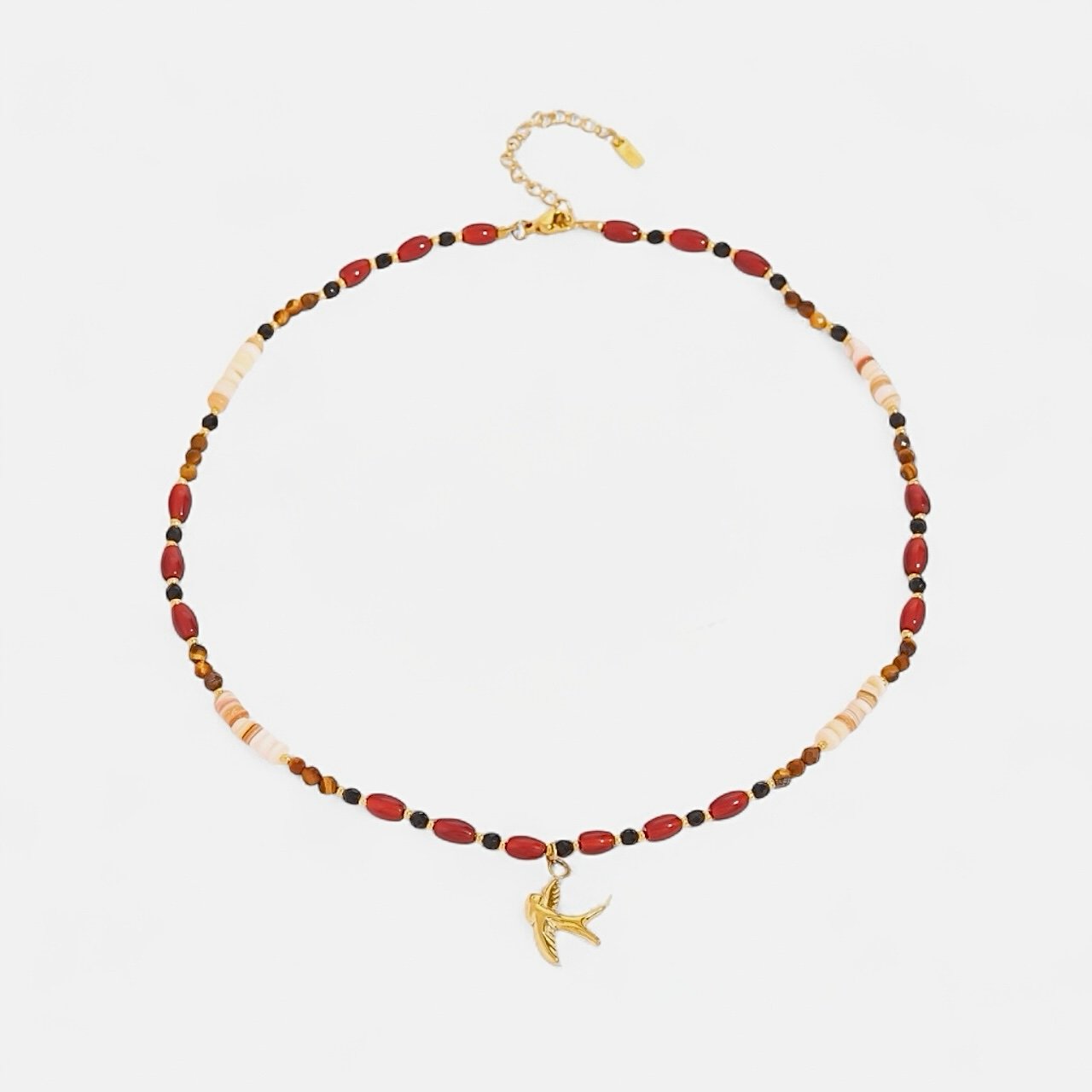 Featuring rich red beads paired with a delicate 18K gold-plated charm, it adds instant warmth and elegance to any look.